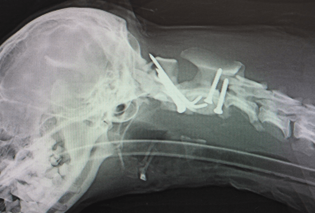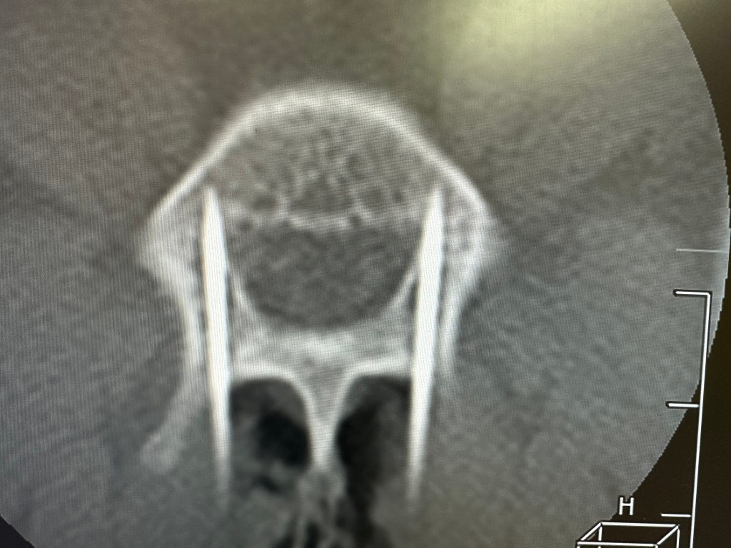 椎弓切除は絶対関節突起残す方の型で。幅広くやりすぎると良いように錯覚しますが変に肉芽みたいになります。椎体奇形で椎弓根(ペディクル)かなりわかりにくいので、感覚で刺すしかないような気がしてます。困らせてくるキュートな犬種、それがフレブル。